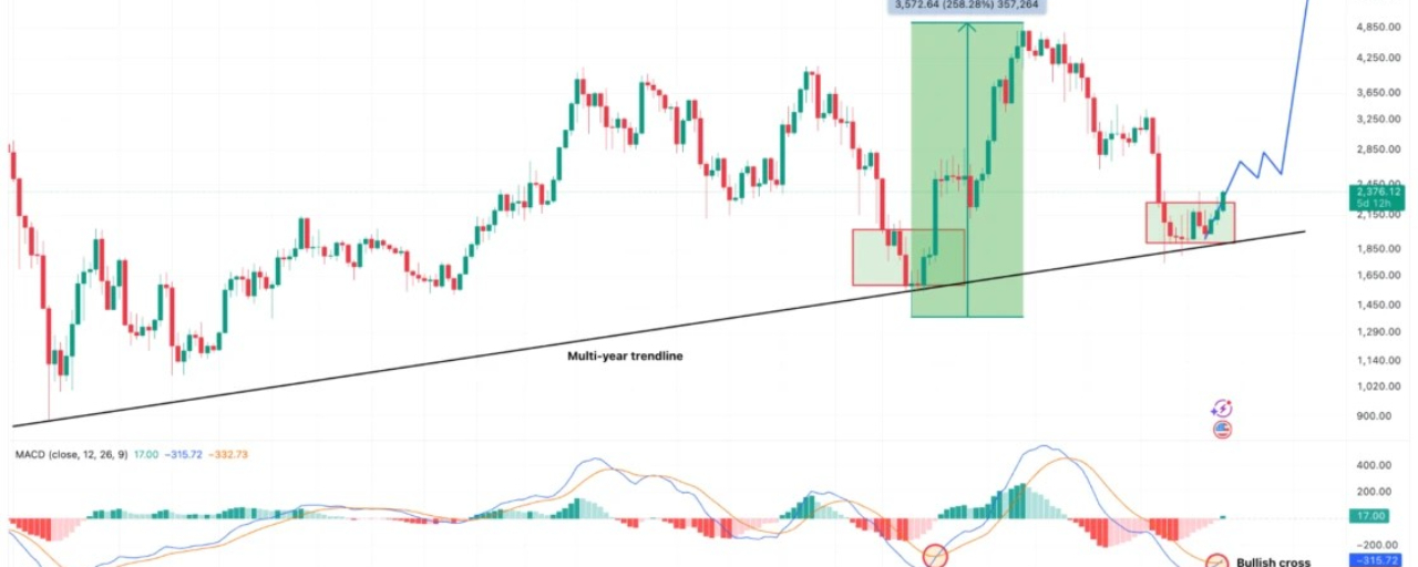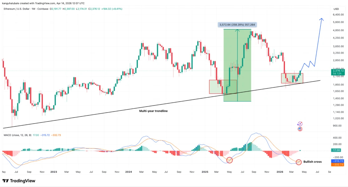 Ether (ETH) is currently displaying a technical pattern that follows a 2025 fractal, in which Ether gained 250%. The weekly timeframe chart shows Ether retesting an ascending trend line that has supported the price since 2022.