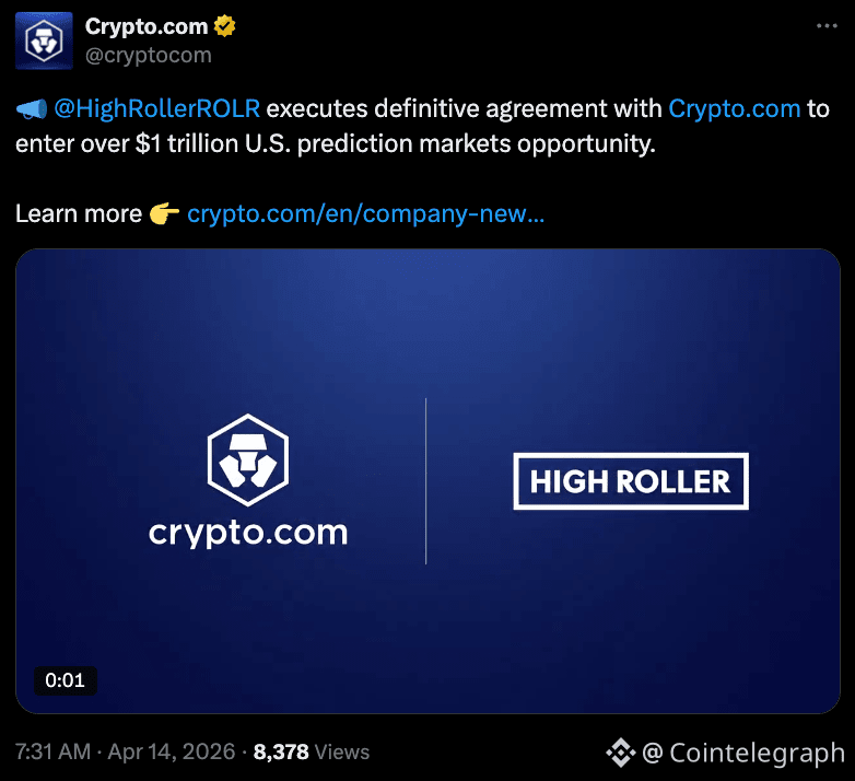 While the CFTC and prediction markets like Kalshi have claimed in court that federal commodities laws preempt state gaming laws, the companies continue to face legal challenges in multiple jurisdictions. Cointelegraph sought a comment from High Roller but did not receive an immediate response.