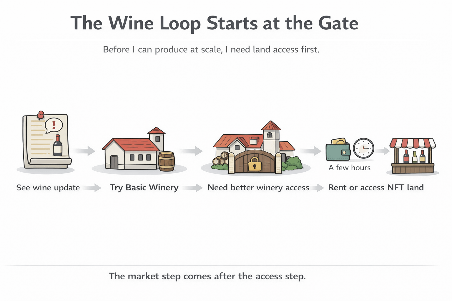 Here’s the real kicker. My first question should have been about wine itself. Which recipes matter. Which output is worth the time. Whether the market can support another loop. Instead I am stuck thinking about access before any of that. I cannot even get to the ROI question without first dealing with the land-gate, and that already tells me where the pressure sits. Not inside the winery. Before it.