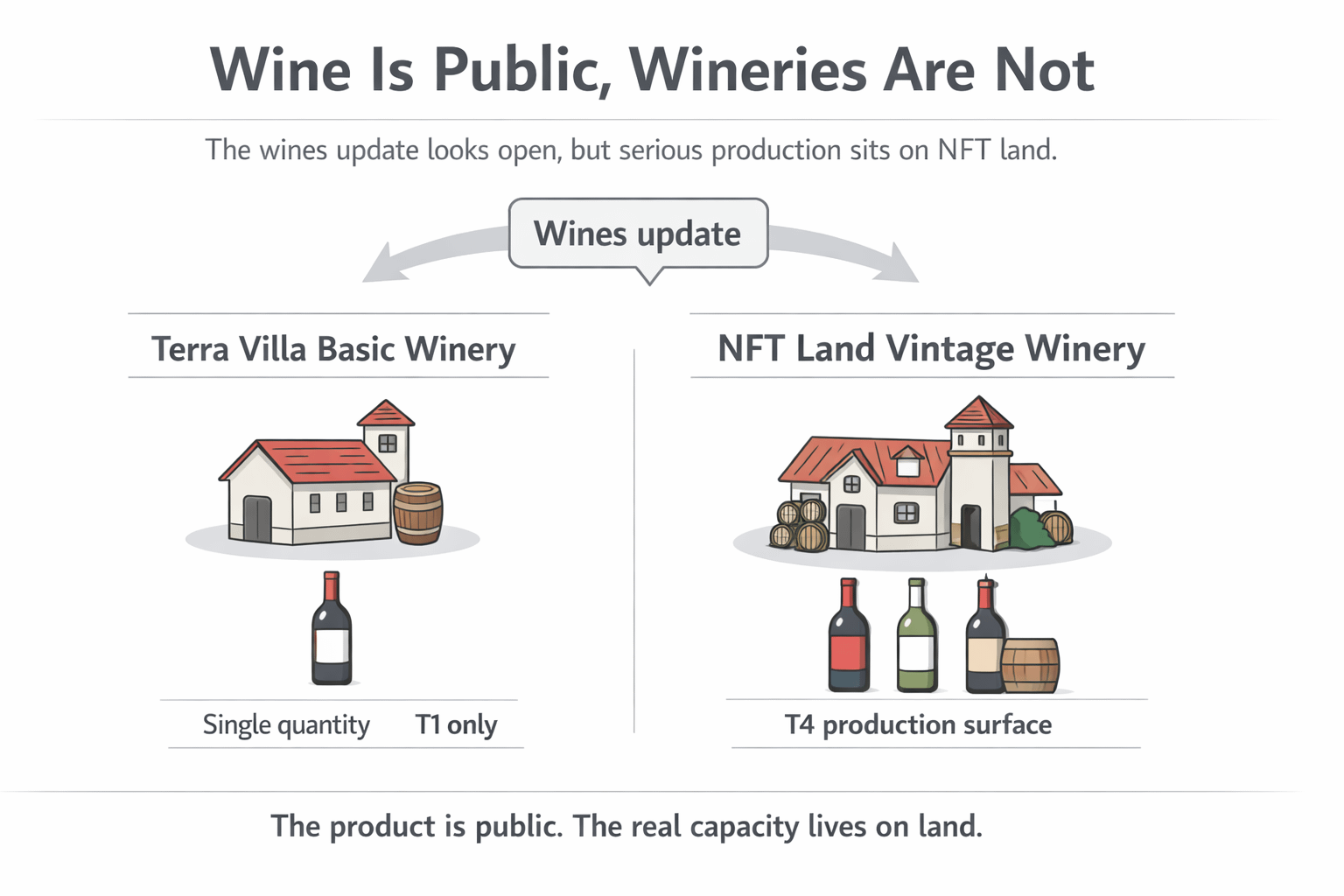 Then I checked the NFT land side and that was enough for me. Those wineries are already Tier 4. They are Vintage Wineries now. That is not some cute little detail buried in the update. That is the update. Once I saw that split, I stopped reading this as a broad crafting expansion. I started reading it as land utility getting pushed again through a tradeable item loop. Honestly, it feels like they are letting everyone smell the feature while keeping the better economics closer to land holders.