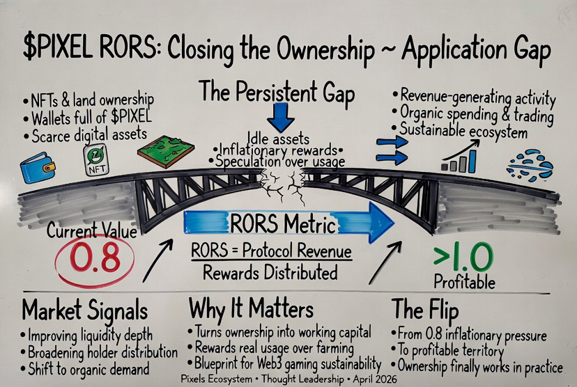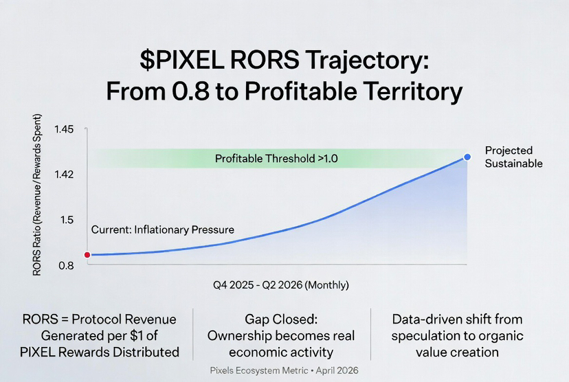 Nie tylko liczby jednego tokena czynią to ważnym. To dowód na koncepcję dla całej branży. Od lat gry Web3 pracują nad udoskonaleniem cyfrowej własności. Następny krok, zyskowna i samowystarczalna aplikacja, zawsze wydawał się teorią. Push RORS PIXELS pokazuje, że można to wprowadzić w życie. Kiedy nagrody są warte więcej niż ich koszt, własność i użytkowanie w końcu się łączą. Gracze naprawdę stają się udziałowcami. Wartość przestaje wyciekać z gospodarek. Luka staje się mniejsza.