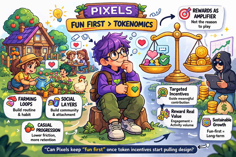 That is why I think the Pixels thesis is credible, but not automatically proven. The direction makes sense. Maybe more sense than the older web3 gaming playbook. But fun-first is a discipline, not a slogan. It requires teams to protect gameplay quality even when token metrics are louder, more visible, and easier to optimize around.If Pixels can keep rewards in the role of amplifier rather than replacement, it may have a stronger foundation than many earlier crypto games ever did.
