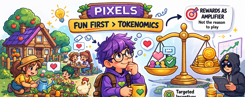 What stood out to me in the Pixels material is not that it talks about token design. Most web3 games do. What stands out is the idea that rewards should not be the core reason people play. They should strengthen behavior that is already meaningful inside the game. That is a much stronger starting point than the old play-to-earn logic.
