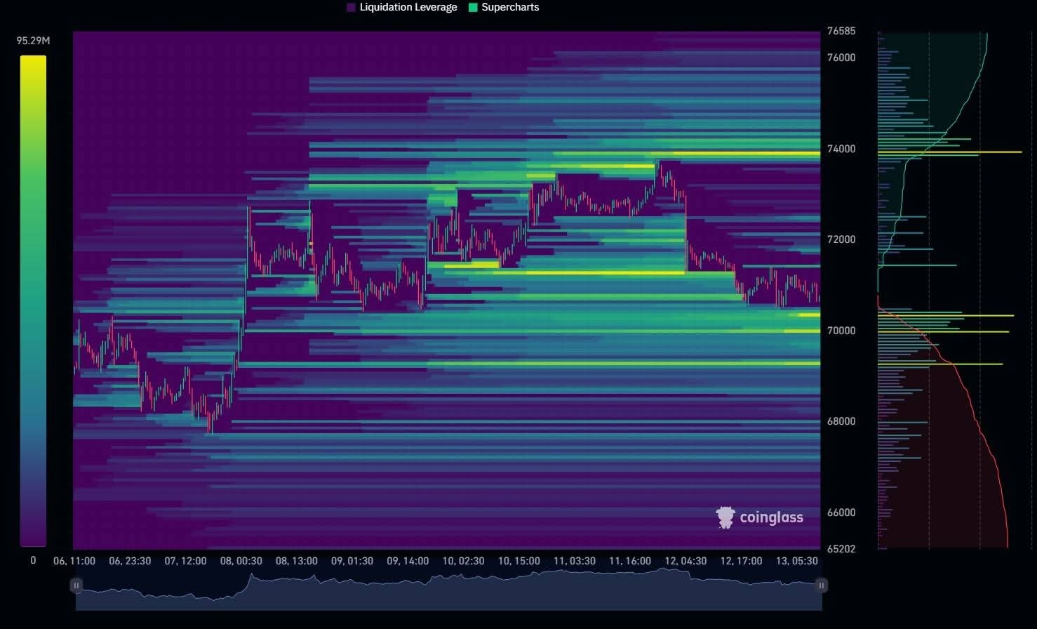 1️⃣ Near Target (Magnet): $70,356 level (liquidating approximately $80 million of buy positions).
