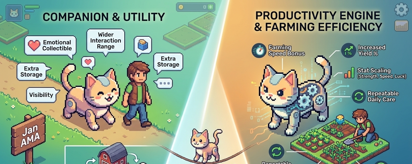 Gdy zwierzęta domowe zaczynają wpływać na szybkość upraw, plon lub efektywność interakcji, przestają być tylko miłym bonusem i zaczynają stawać się częścią gospodarki gry. Jeśli bonus jest zbyt mały, nikt tego nie zauważa. Jeśli jest zbyt silny, zwierzęta domowe stają się obowiązkowe. To trudna granica do przejścia, zwłaszcza że Pixels już korzysta z projektowania zwierząt domowych opartego na statystykach.