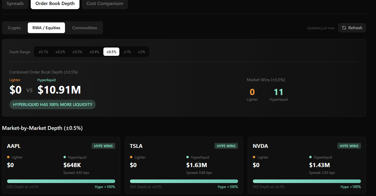 Hyperliquid的流动性,目前大约是Lighter的两倍。这意味着什么?