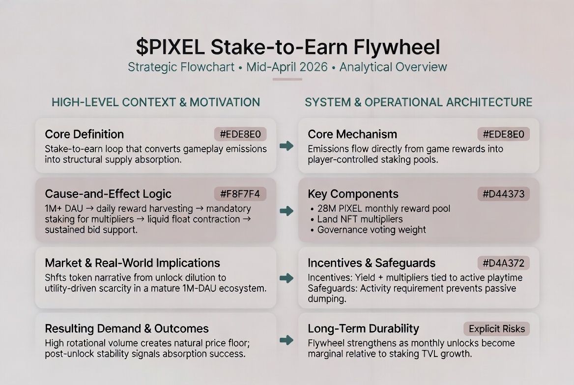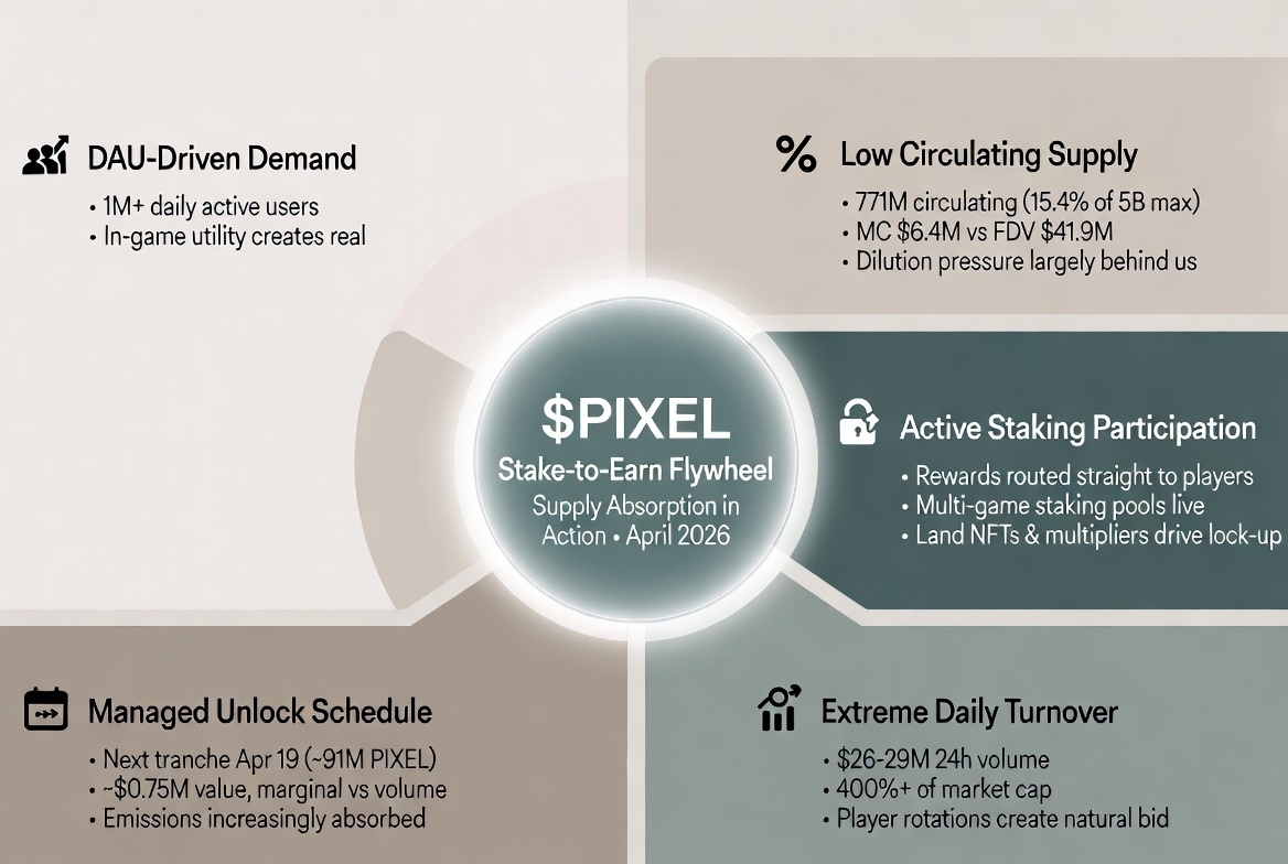 Look at the unlock schedule and it gets even more interesting. The next tranche hits April 19—around 90 million PIXEL to advisors, roughly 1.8% of total supply or about 12% of the current float. On the surface that should be noisy. Yet the staking dashboard shows the ecosystem rewards pool (34% of total allocation) is still flowing straight into active participants who have to keep playing to maximize it. Land owners get multipliers, stakers vote on which new games get funding, and the whole thing rewards sustained engagement over one and done farming. With daily active users now sitting at a million, that reward demand isn’t abstract it’s daily foot traffic creating a natural bid.