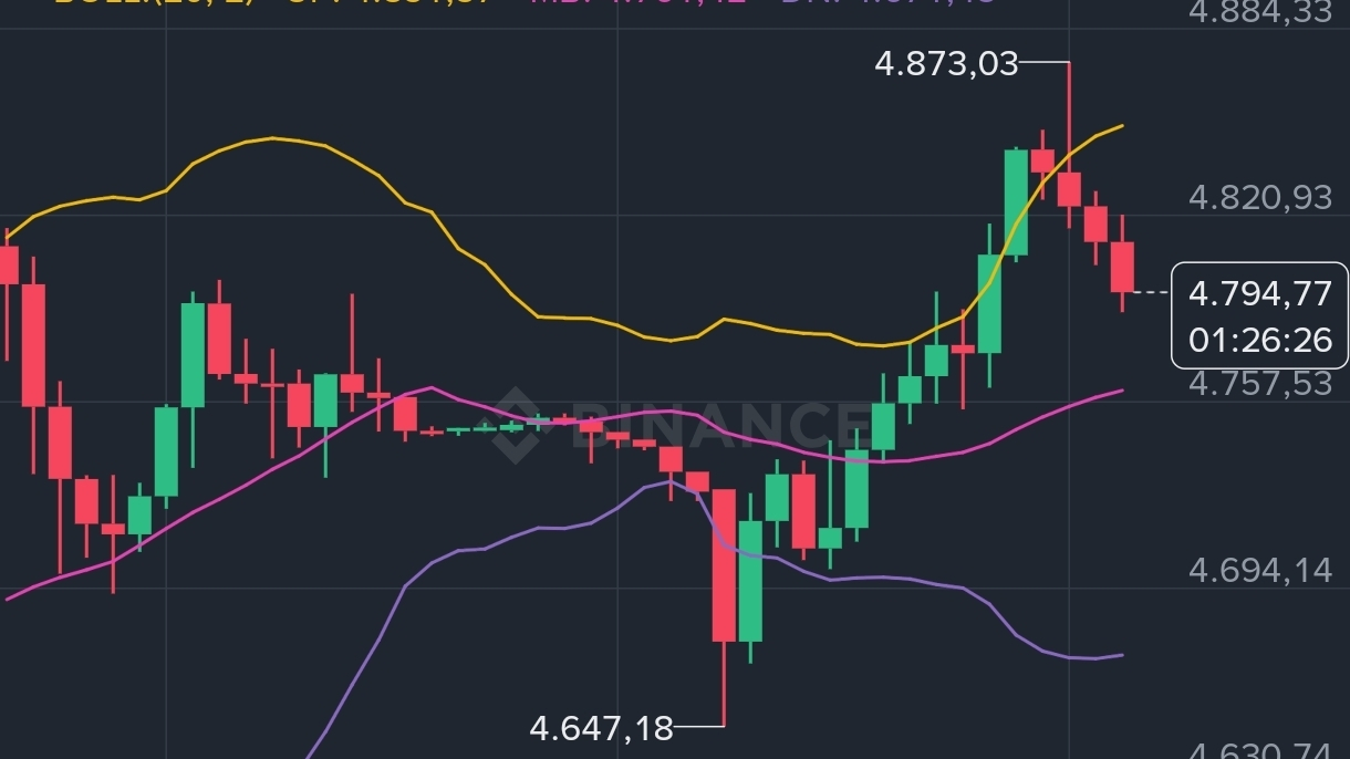 Vàng phản ứng tích cực ngay: giá nhảy $100/oz lên trên $4,800 — mức cao mới. Hiện tại $XAU đang ở $4,795 trên khung 4H Binance. EMA34 ($4,797), EMA89 ($4,641), EMA200 ($4,511) — giá nằm gần EMA34, trên EMA89 và EMA200. Cấu trúc tổng thể vẫn bullish.