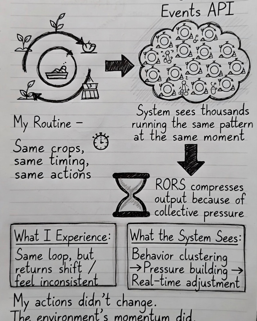 Too many players were running similar loops at the same moment. The system was already saturated at the behavior level, even before it showed up anywhere else.