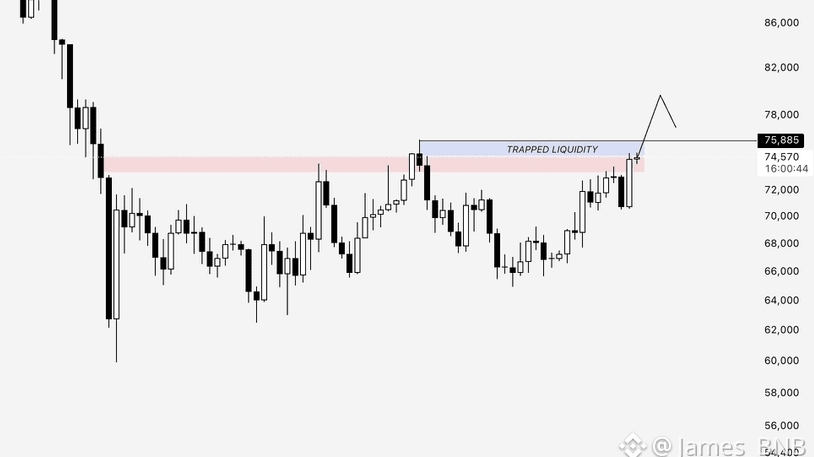 That 76K level matters more than people think. Late shorts leaned heavy there, and earlier breakout buyers already got punished once. If price flips that zone into support… yeah, that’s where it can squeeze.