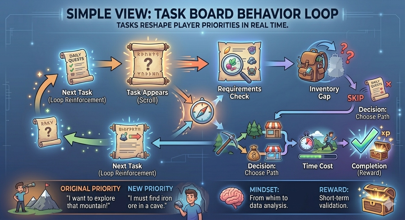 I opened the game, checked the Task Board before touching the field, saw one crafted output I didn’t have — and the entire session changed shape in seconds.