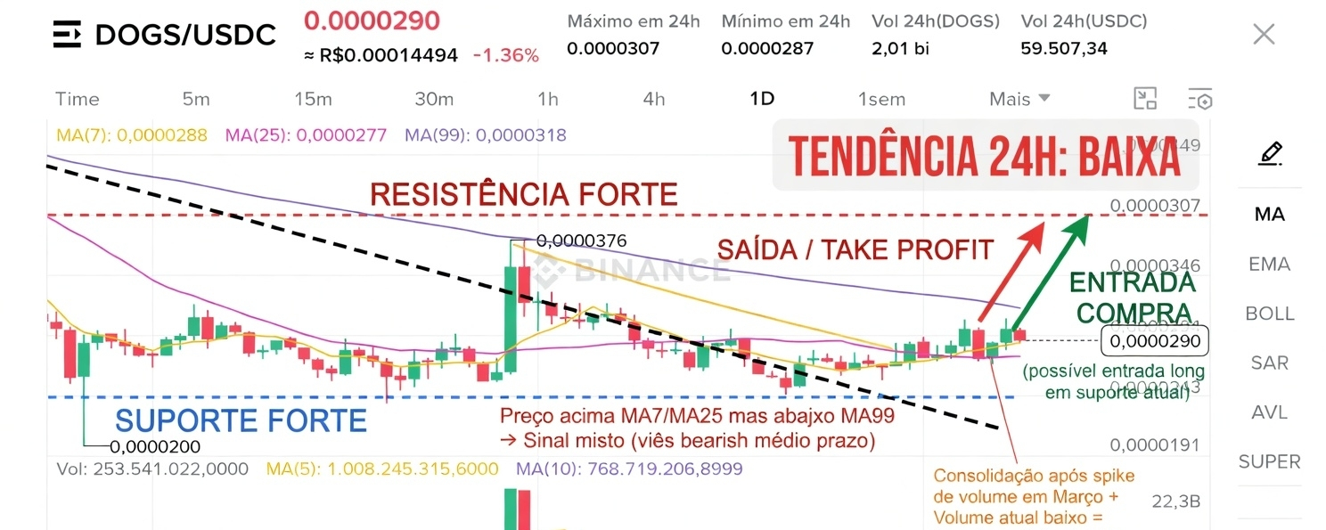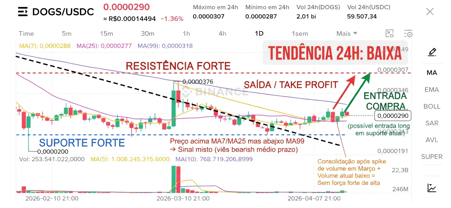 - Volume 24h está baixo (2,01 bi DOGS) se comparado ao spike de março, sem força compradora agressiva. Os últimos candles mostram corpos pequenos com mistura de verdes e vermelhos, indicando consolidação sem convicção.