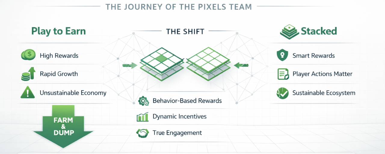 Pixels đã từng là một game farming có token sau đó trở thành một hệ sinh thái có người chơi thật và bây giờ có vẻ đang thử xây một lớp incentive mới trên đó. Hành trình này nếu nhìn kỹ không phải là một cú pivot lớn mà là một chuỗi điều chỉnh nhỏ, liên tục và có phần thận trọng.