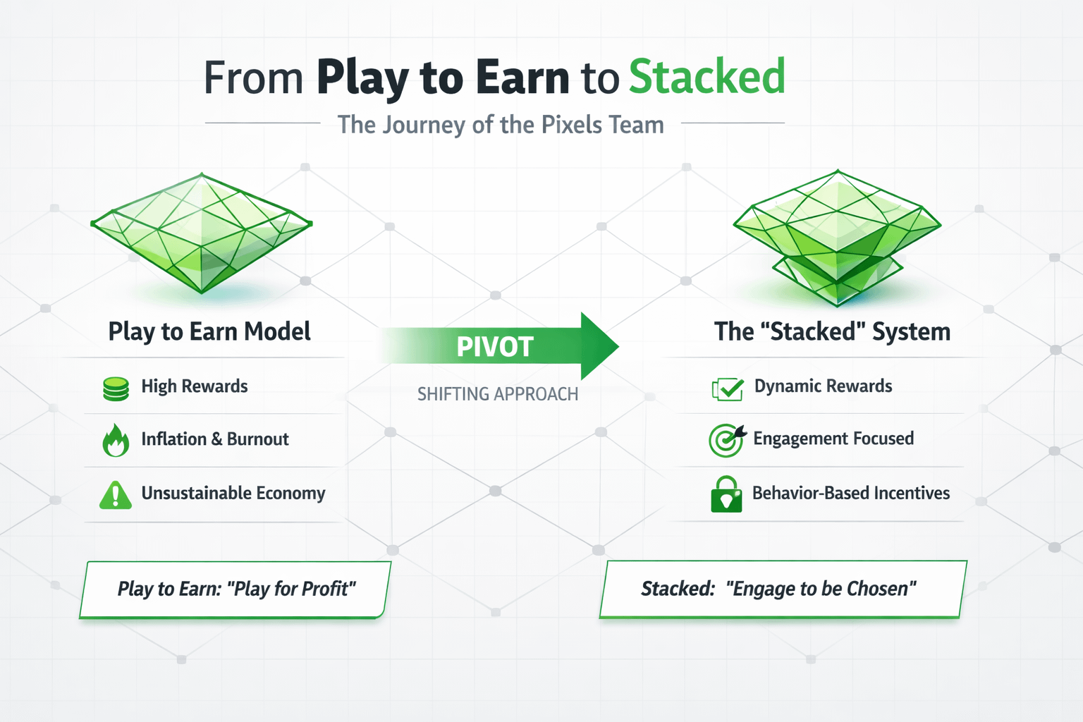 Gần đây tôi bắt đầu thấy đội ngũ đứng sau Pixels đi theo một hướng hơi khác. Không phải là thay đổi hoàn toàn mô hình, không phải là phủ nhận Play to Earn mà có vẻ là đang cố “bọc lại” nó bằng một lớp logic mới và họ gọi đó là Stacked.