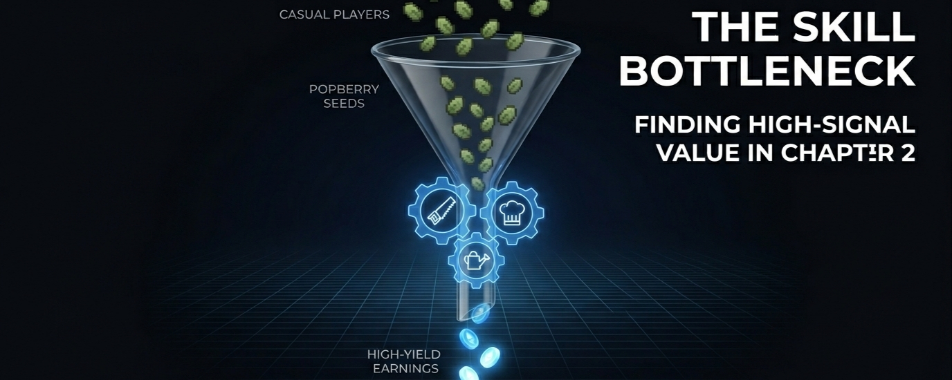 To capture value in Chapter 2, you must understand Scarcity. The Task Board at Buck’s Galore acts as a filter. While early-game tasks are accessible to everyone, the high-payout PIXEL orders are gated by skill levels. This is the Skill Bottleneck.