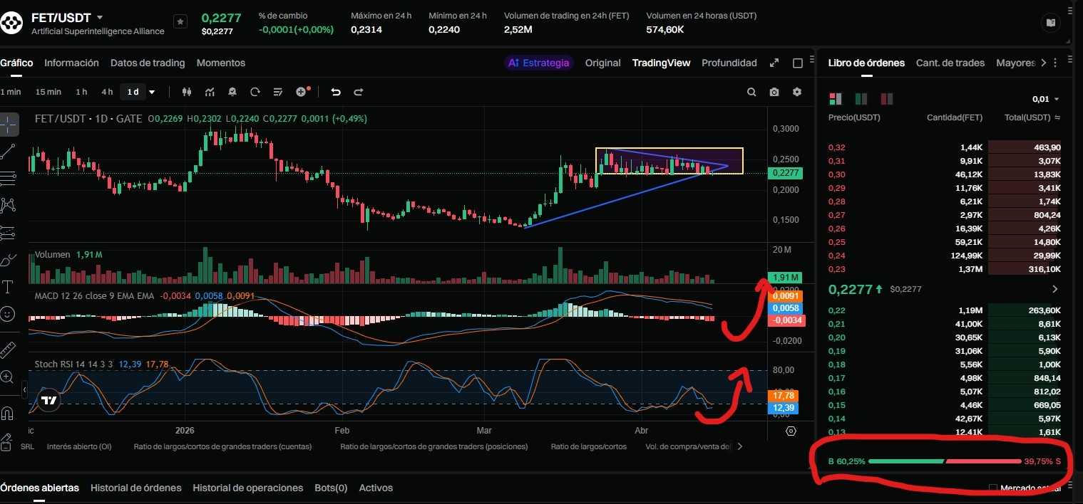 En los gráficos de FET se observa una caja de acumulación, con el RSI diario en mínimos que apoyan una posible subida, además de una profundidad que refleja interés comprador.