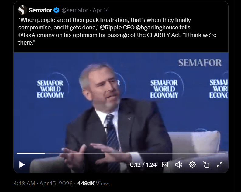 CEO Ripple ujawnił, że okno na uchwalenie Ustawy o Klarowności jest obecnie otwarte, ale ostrzegł, że ta okazja może nie trwać wiecznie.