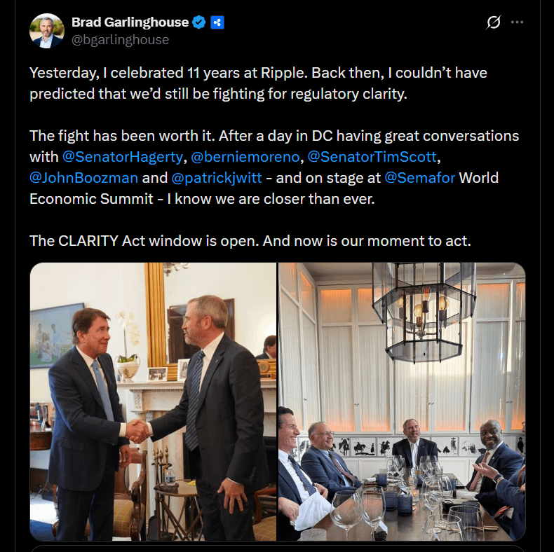 Złożył uwagi podczas obchodów 11. rocznicy w Ripple, reflektując nad długą kampanią firmy na rzecz jaśniejszych regulacji dotyczących aktywów cyfrowych w Stanach Zjednoczonych.