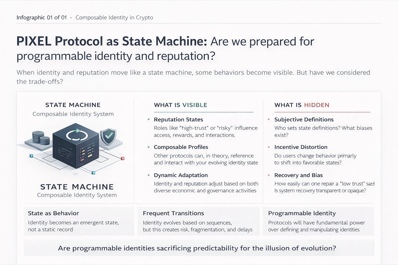 If users know their actions shift identity states that are visible across systems, behavior will change. Not necessarily in a good way. Some will optimize for state transitions rather than genuine participation. Others might avoid risk entirely to preserve a favorable identity profile.
