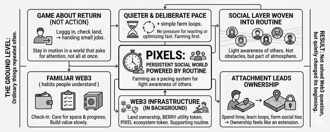 It explains why the game can look simple from the outside and still hold attention. It explains why the social layer matters even when no one is making a big speech about community. It explains why the infrastructure matters mostly when it stops getting in the way. And it explains why people keep trying to describe Pixels in bigger terms than it sometimes needs.