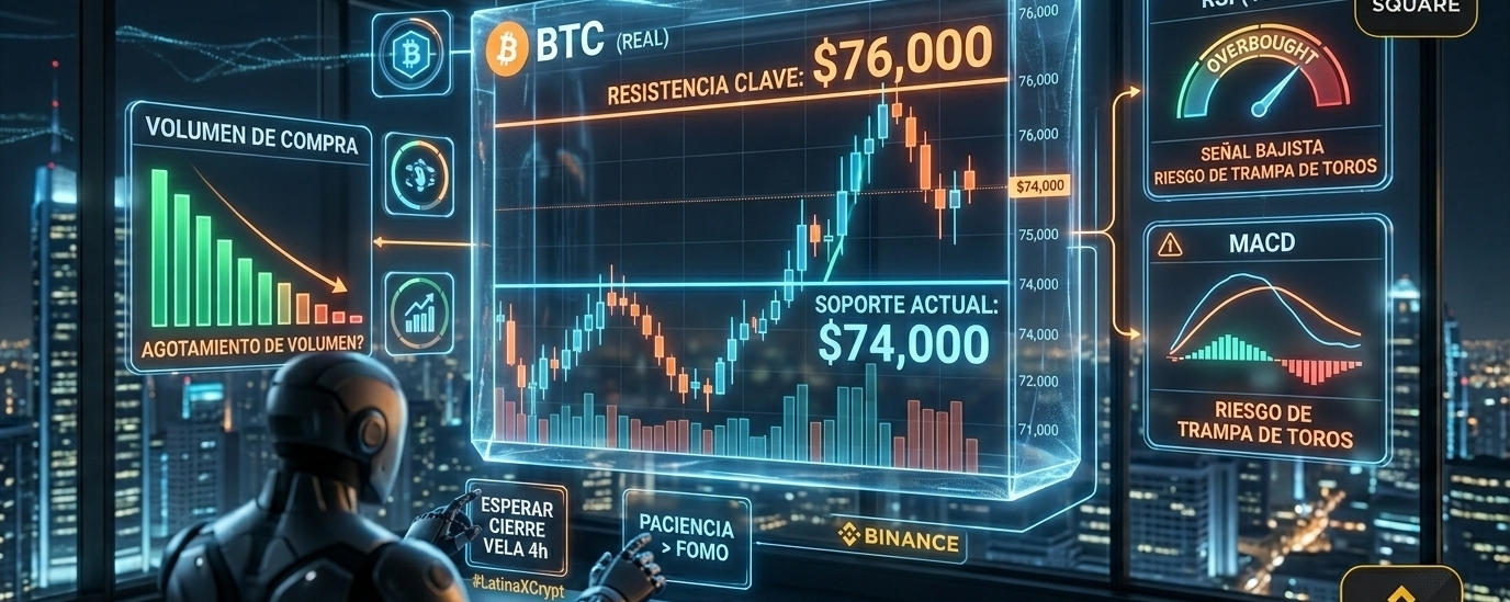 El mercado nos está dando señales mixtas hoy. Tras el impulso que llevó a Bitcoin a testear los $76,000, estamos viendo un retroceso hacia la zona de los $74,000. La gran pregunta es: ¿Estamos tomando aire para buscar los $80k o el volumen nos está avisando de un agotamiento?