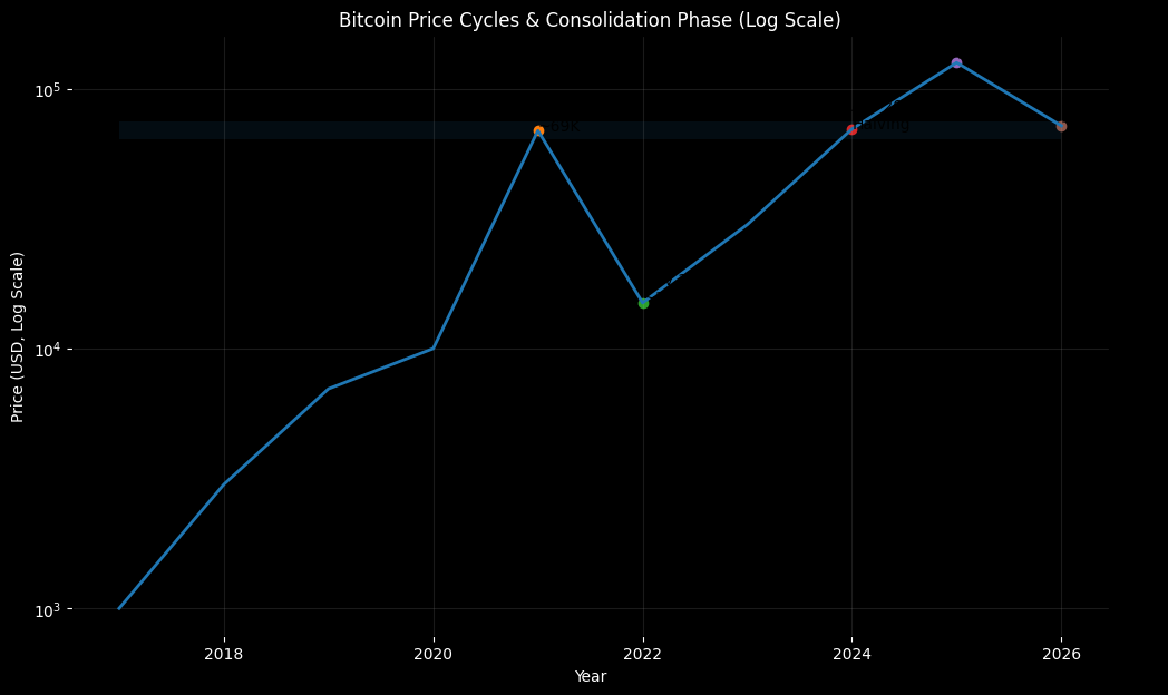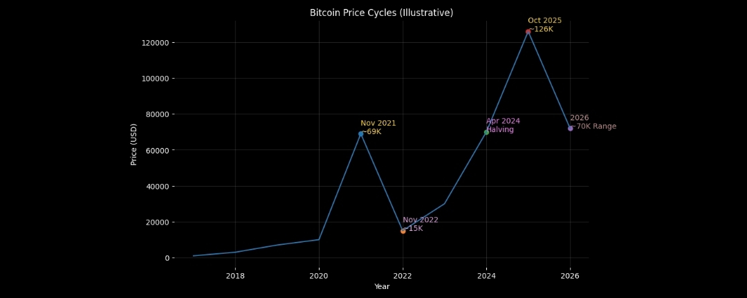 December 2025 – January 2026 → price falls into $60K–$70K range