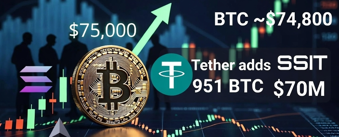 Bitcoin price action: BTC abhi ~$74,000 - $75,000 ke around trade kar raha hai. Recently $75k+ touch kiya, Nasdaq aur S&P ke saath rally mein. Geopolitics (Iran-related tensions) ke baad thoda recover hua, short squeeze aur ETF inflows se support mila. Kuch din pehle $71k ke neeche gaya tha lekin ab stable/positive hai.dfec49