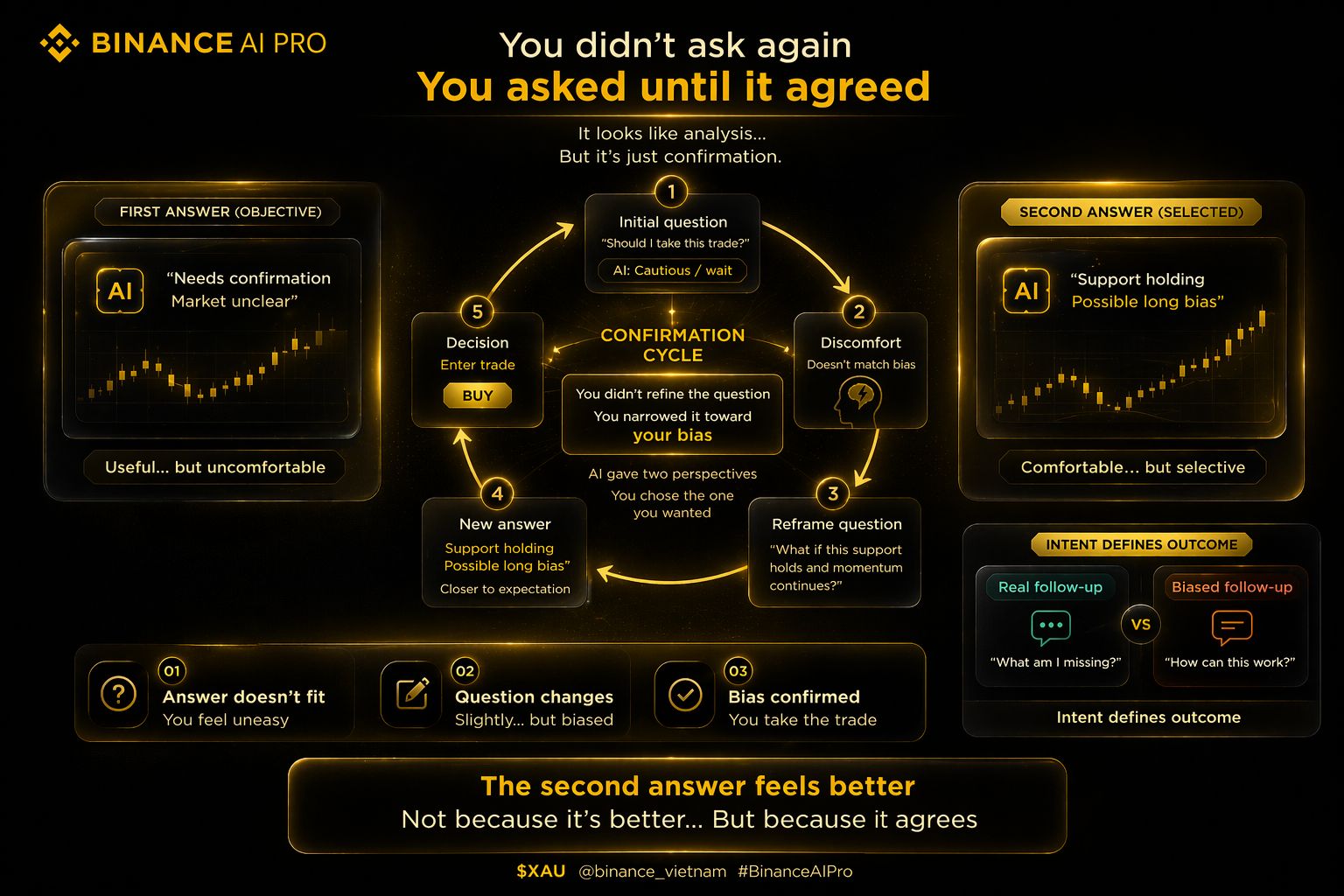 Điều khiến cái này khó nhận ra là câu hỏi thứ hai thường trông “chặt” hơn. Cụ thể hơn. Nghe giống như mình đang đi sâu hơn vào vấn đề. Nhưng thực tế thì lại là thu hẹp câu hỏi theo hướng có lợi cho bias của mình.