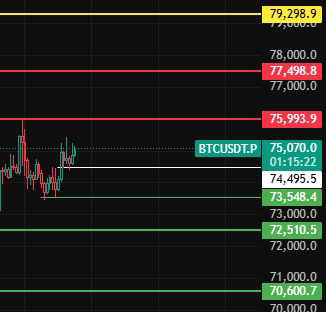 BTC dziś zwróć uwagę na poziom 74500, jeśli tylko powrót nie złamie tego poziomu, to trend wzrostowy się wzmocni, kontynuuj w górę, najpierw zwróć uwagę na poprzedni szczyt 76, ten poziom, jeśli nie zostanie silnie przełamany, na niższym poziomie jeszcze spadnie, tylko silne przebicie w górę do 77500-79300-81500 w tych rejonach czekaj na pozycje krótkie!