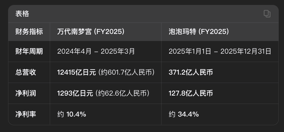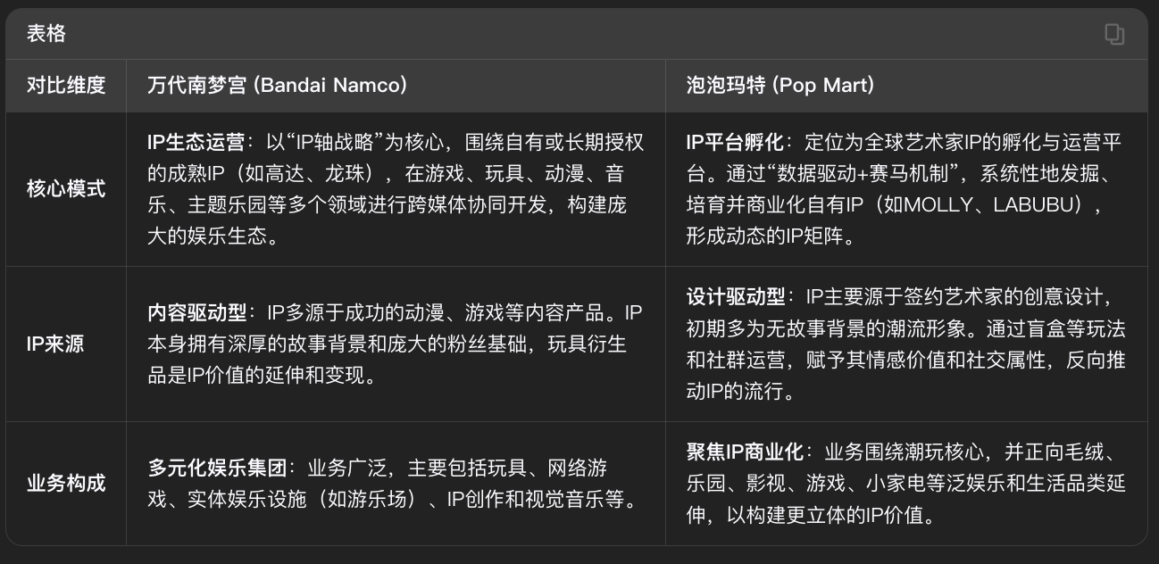 Mimo że obie firmy działają w szerokim zakresie „modnych zabawek” i „IP”, ich modele biznesowe, ścieżki rozwoju i wyniki finansowe wykazują znaczące różnice. Krótko mówiąc, Bandai Namco jest gigantem w „ekosystemie IP”, podczas gdy Pop Mart jest nowym graczem w „inkubacji platformy IP”.