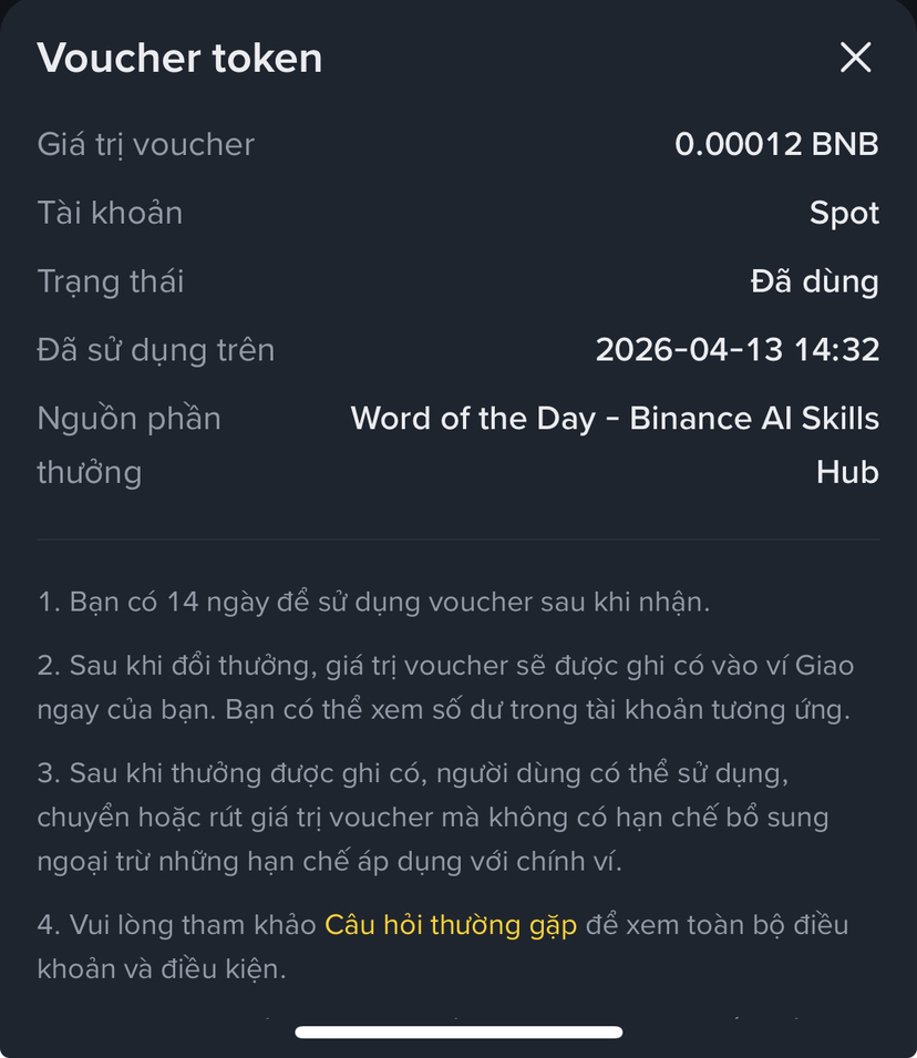 Cách nhận thưởng nghe còn dễ hơn pha mì: đọc từ khóa, trả lời nhanh, bấm nhận voucher. Đến lúc mở mục thưởng ra thấy dòng chữ “Đã dùng”, BNB đã tự động nhảy vào ví Spot, cảm giác giống như mở túi áo cũ mà phát hiện tiền lì xì còn sót lại vậy!