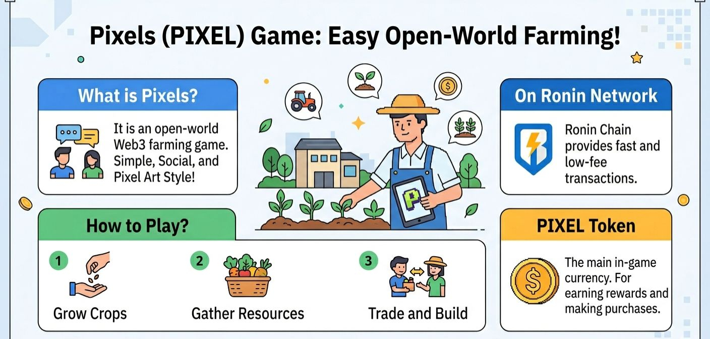 Aaj kal web3 gaming kaafi tezi se grow kar rahi hai aur is sab ke beech Pixels game ek bahut hi unique aur fun experience de raha hai. Ye basically ek open-world farming game hai jo Ronin network par chalta hai. Agar aapne kabhi Stardew Valley jaise games khele hain to iska feel bilkul waisa hi hai, bas farq itna hai ki isme blockchain ki power judi hui hai jisse aapke in-game items ki real value hoti hai.
