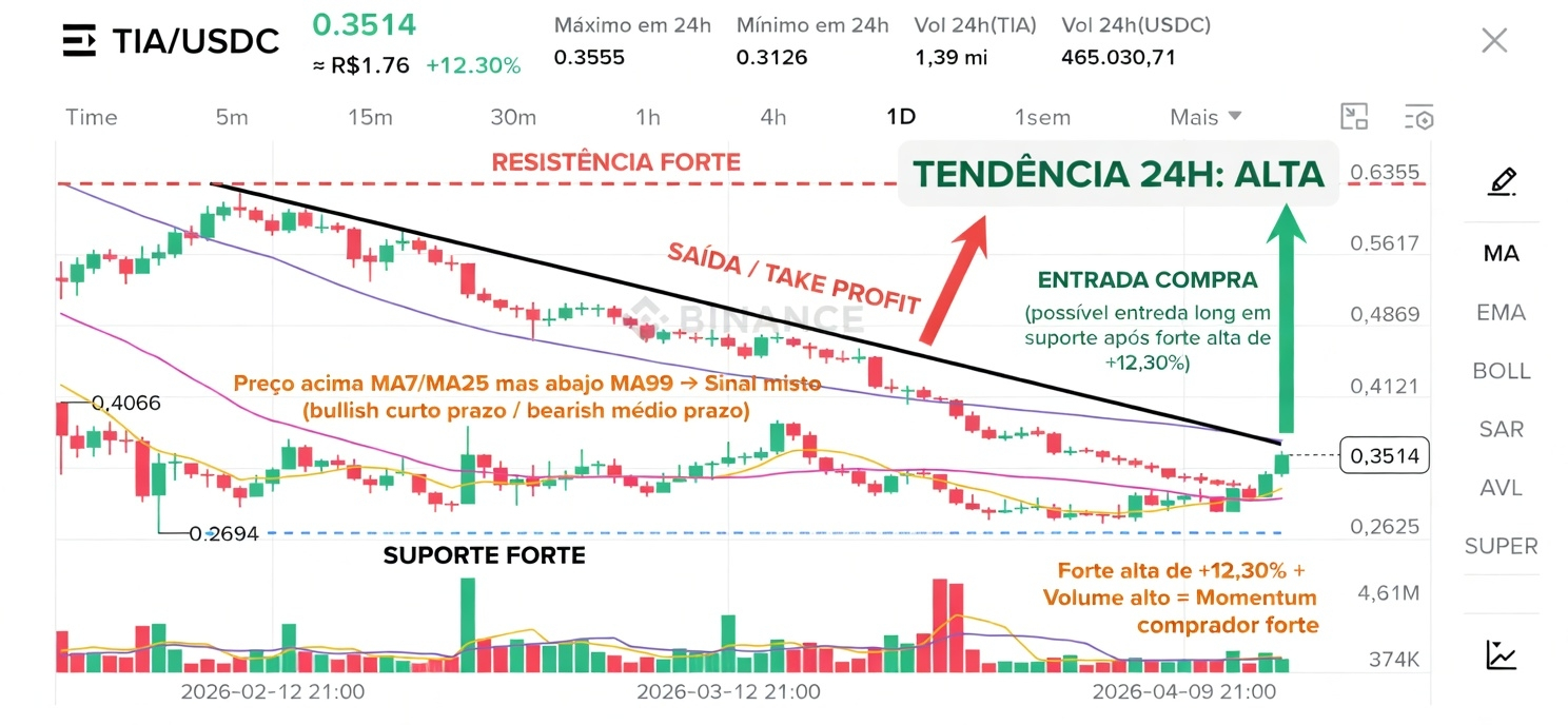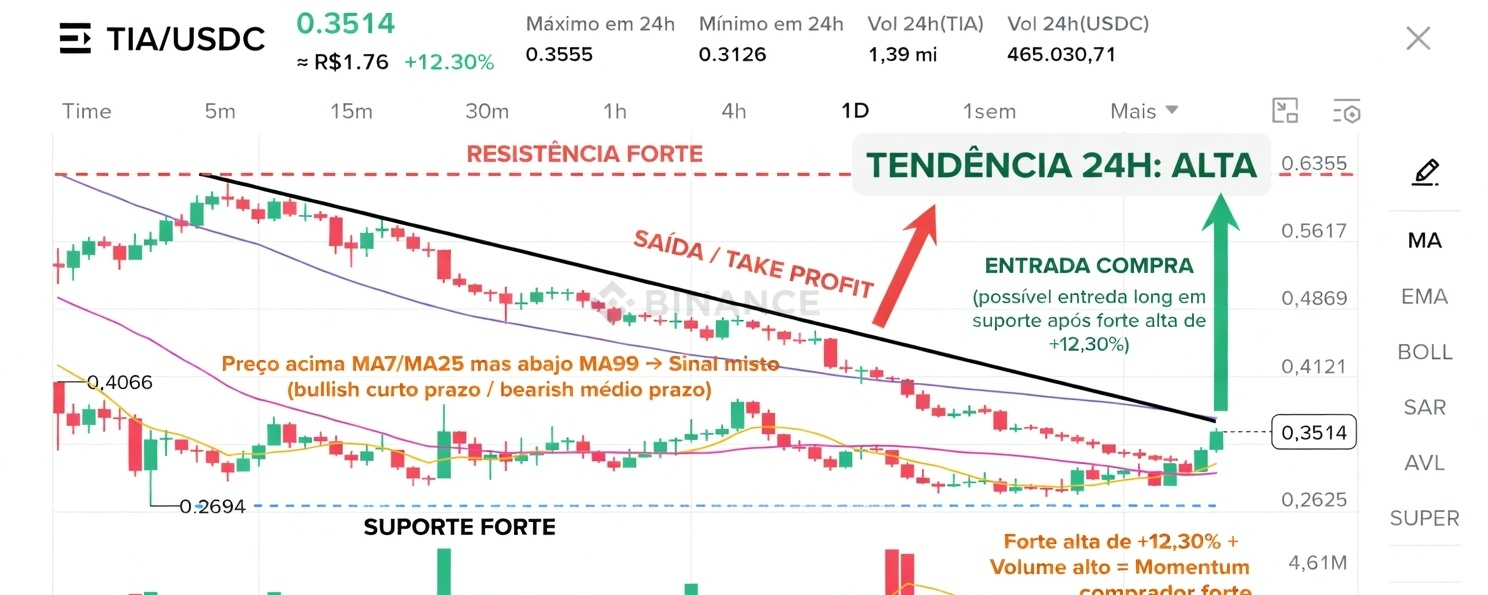 - Volume 24h está sólido (1,39 mi TIA), com pico claro no candle verde — indica entrada agressiva de compradores com convicção.