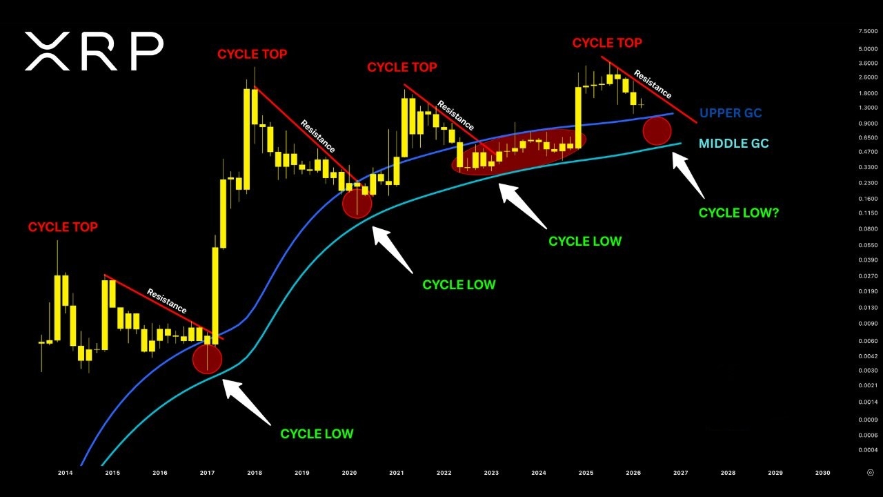 jawne znaczenie: wykres wyraźnie pokazuje, że XRP przechodzi przez wyraźne cykle cenowe. Po każdym szczycie cenowym, waluta przechodzi przez okres korekty i spadku, przerywany obszarami oporu, które uniemożliwiają szybki wzrost, a następnie zaczyna budować nową bazę cenową przed kolejnym skokiem. Niebieskie i zielone linie (Upper GC i Middle GC) reprezentują dynamiczne poziomy wsparcia, gdzie przecięcie między nimi lub zbliżenie się do nich wskazuje na potencjalne punkty odbicia w górę, wskazując na "dno cyklu" (Cycle Low).