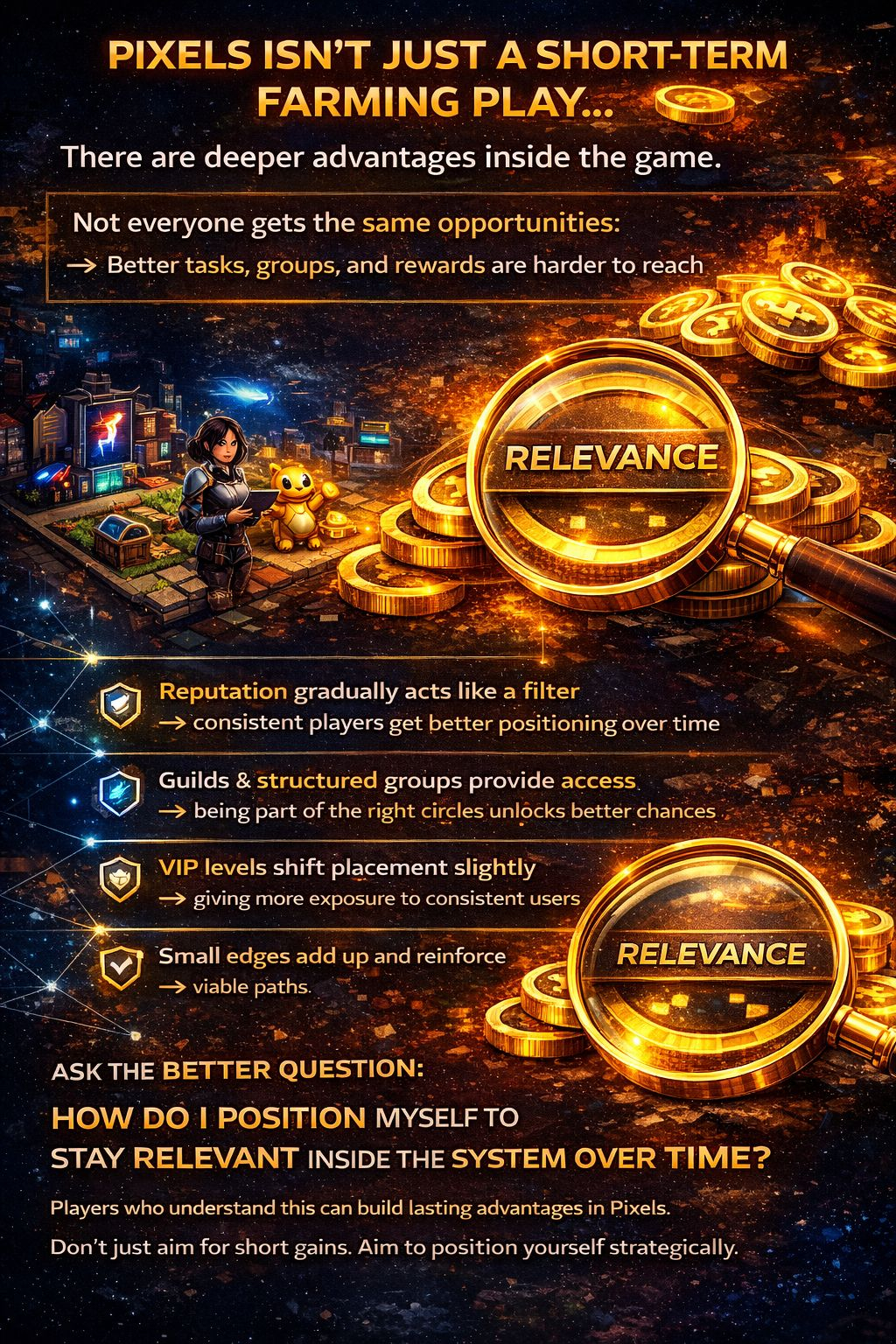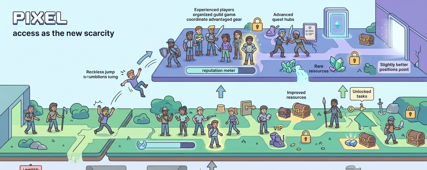 Nie każdy ma te same możliwości wewnątrz Pixels. Niektórzy gracze odblokowują lepsze zadania, dołączają do silniejszych grup lub konsekwentnie pozycjonują się bliżej bardziej wartościowej aktywności. I to nie dzieje się losowo, zazwyczaj jest to wynikiem czasu, konsekwencji i tego, jak system ocenia twoje uczestnictwo.
