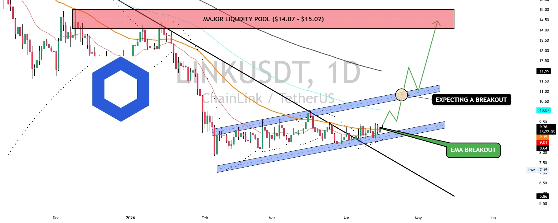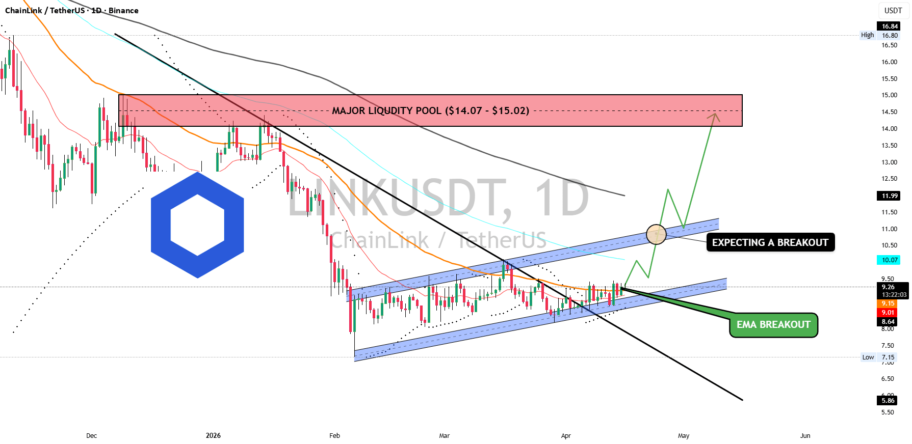 LINKUSDT pokazuje wczesne oznaki byczej odbudowy po długotrwałym trendzie spadkowym, z ceną próbującą wyłamać się z opadającej struktury, jednocześnie formując rosnący kanał.
