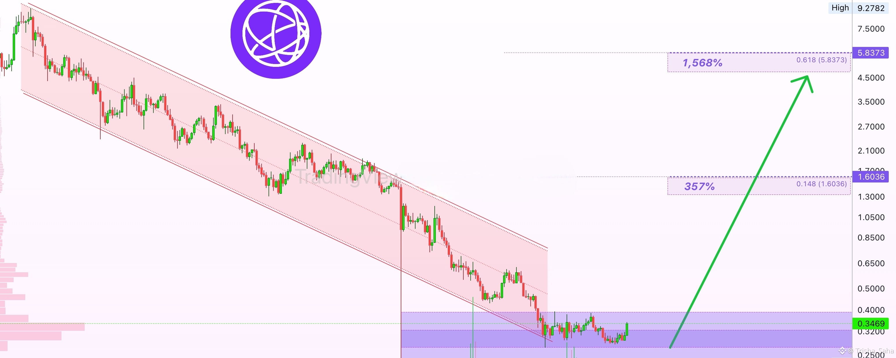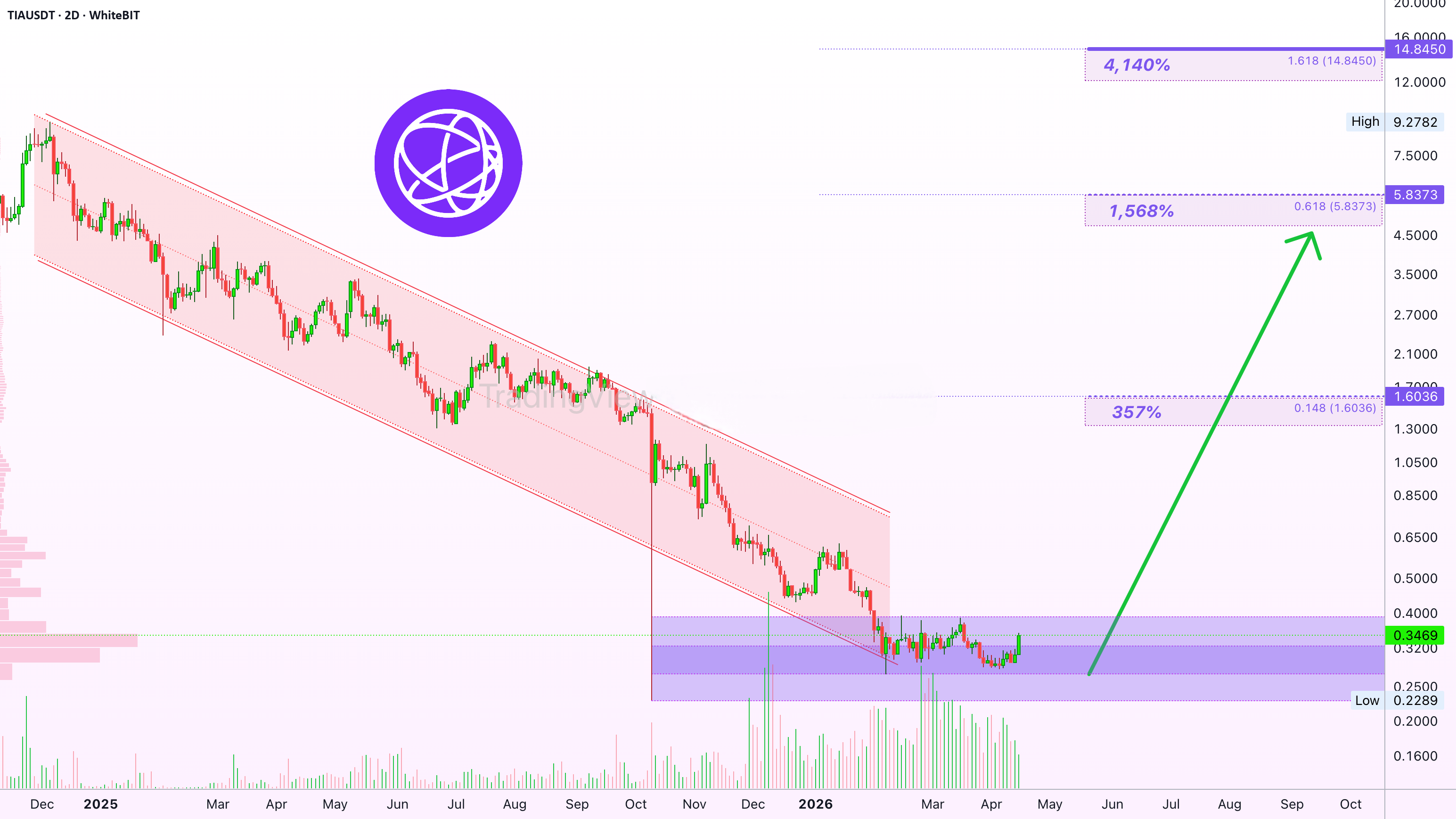 Celestia (TIAUSDT) zaczęła spadać w lutym 2024 roku. Następnie nastąpiła przerwa, kilka drobnych działań wzrostowych, a potem przedłużający się spadek, który widzisz na tym wykresie.