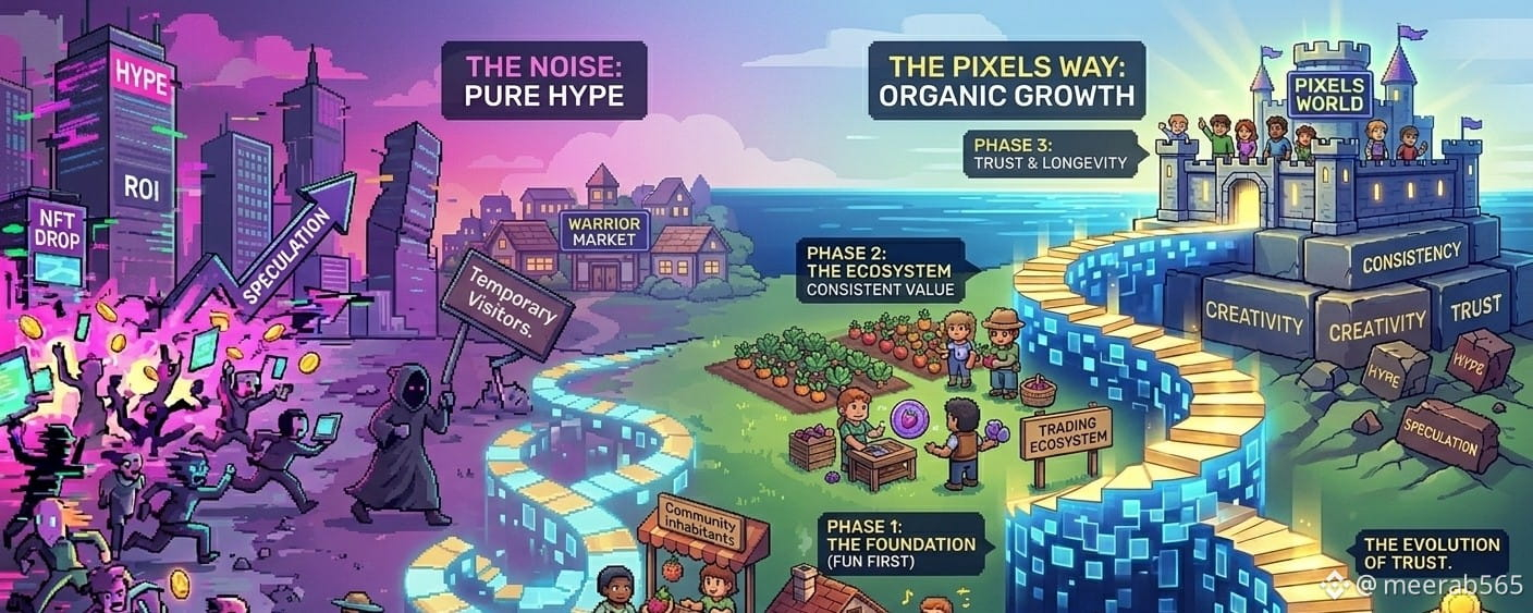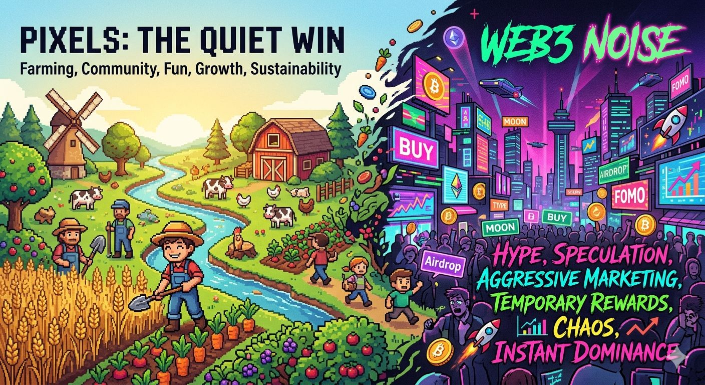 Był czas, gdy większość projektów Web3 wchodziła na rynek jak wojownicy rzucający się na pole bitwy. Głośne ogłoszenia, agresywny marketing i obietnice natychmiastowej dominacji wypełniały każdy harmonogram. Społeczności formowały się szybko, hype przemieszczał się szybciej niż logika, a uwaga często decydowała, kto wyglądał na odnoszącego sukcesy. W środku tego cyfrowego chaosu, Pixels zrobiło coś niezwykłego, nie próbowało krzyczeć głośniej niż wszyscy inni. Zamiast tego, cicho otworzyło swoje drzwi i pozwoliło graczom wchodzić naturalnie. Na początku wiele osób niedoceniało Pixels. Wyglądało prosto w porównaniu do złożonych platform DeFi i wysokich łańcuchów konkurujących o nagłówki. Podczas gdy inni walczyli o widoczność, Pixels skupiło się na doświadczeniu. Gracze nie byli natychmiast wpuszczani w skomplikowane systemy, mieli możliwość eksploracji, uprawy, handlu i interakcji w swoim własnym tempie. Ta mała różnica zmieniła wszystko. Zamiast przyciągać tymczasowych gości, Pixels zaczęło budować prawdziwych mieszkańców. Gdy rynek Web3 wszedł w okresy niepewności, pole bitwy stało się jaśniejsze.