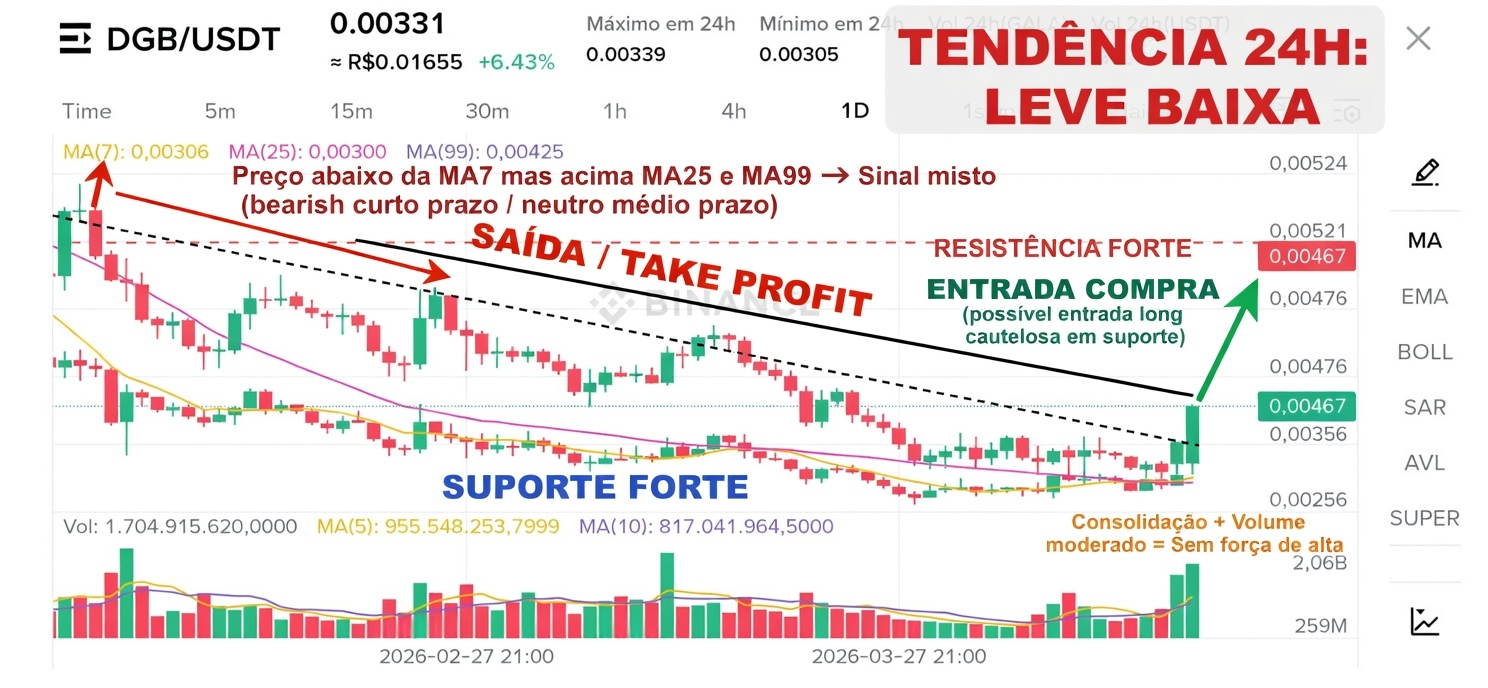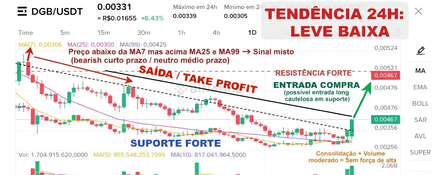 - Volume 24h está moderado (34,94 mi DGB), sem picos de compra ou venda agressiva. Os últimos candles são pequenos e indecisos, indicando consolidação sem convicção.