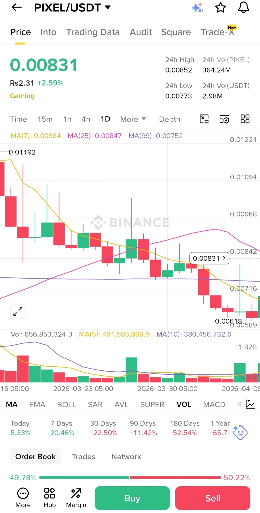 The PIXEL/USDT pair is currently trading around 0.00831, showing a mild intraday recovery (+2.59%), but the broader structure still reflects bearish pressure. Over the past month, price action has been trending downward, with lower highs and lower lows dominating the chart.