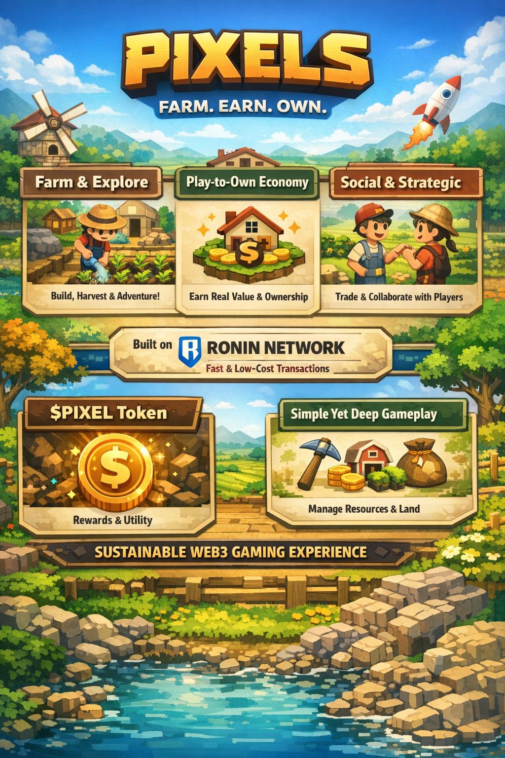 Built on the Ronin Network, Pixels benefits from fast and low-cost transactions, which makes the experience smooth and practical. No one wants to deal with high fees just to enjoy a game and Pixels avoids that mistake.