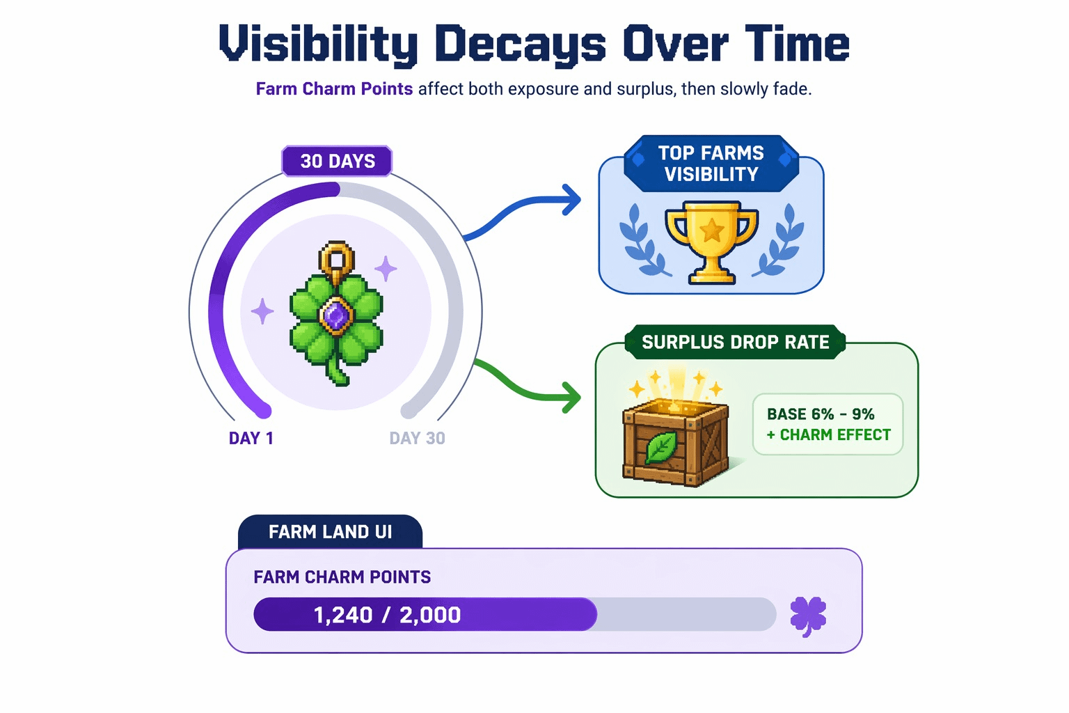 Let’s be real, charms are basically a tax disguised as furniture. They’re recurring maintenance for attention, and once visibility and rewards sit on the same 30 day decaying layer, your land stops being passive. You’re not just managing a farm loop anymore. You’re managing whether the game keeps surfacing that farm to other players, and whether the reward side still has enough weight to justify the upkeep.