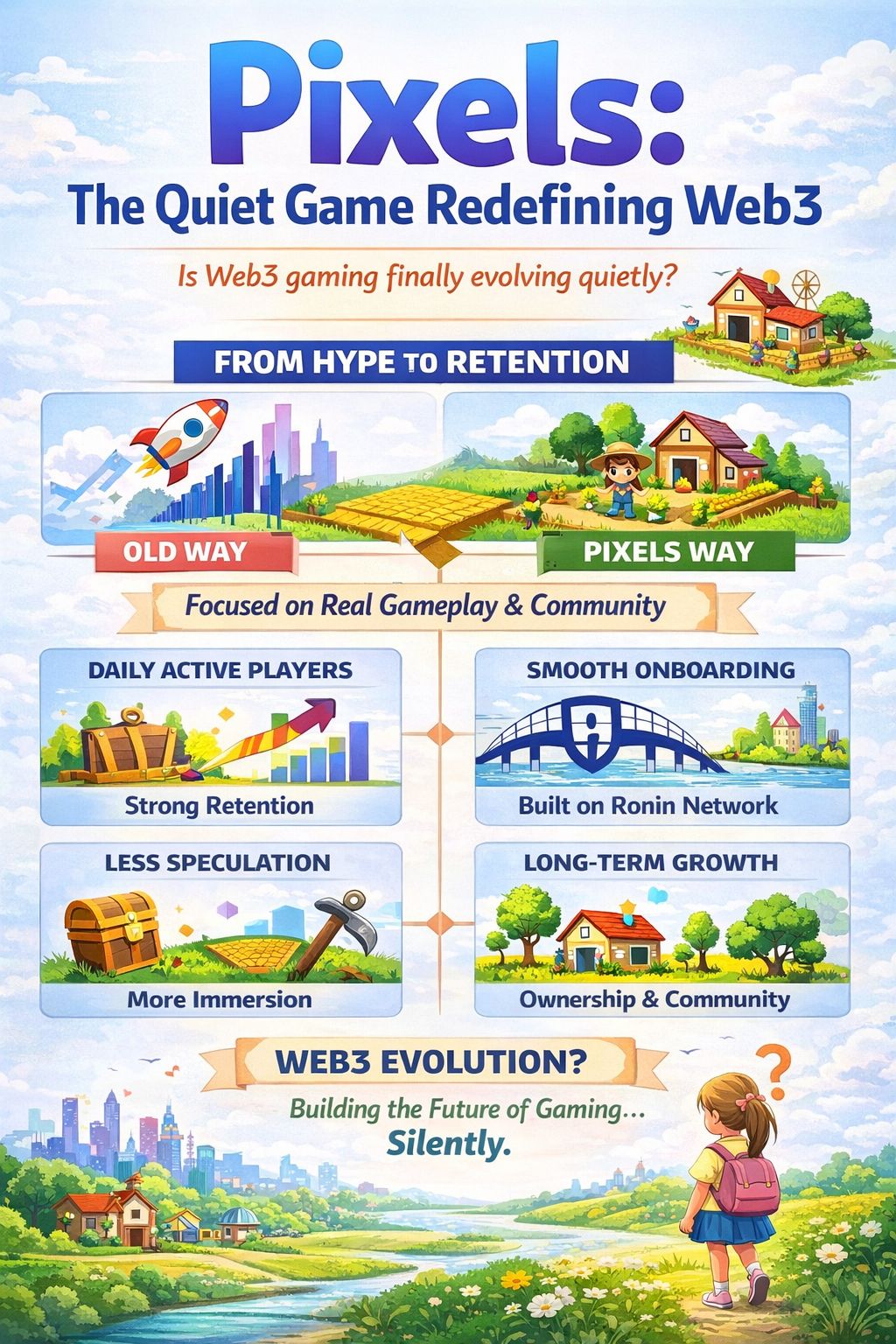 Pixels represents a different mindset. Instead of starting with technology, it starts with the user. Simple gameplay loops, social interaction, and gradual progression create an environment people return to—not because they have to, but because they want to.