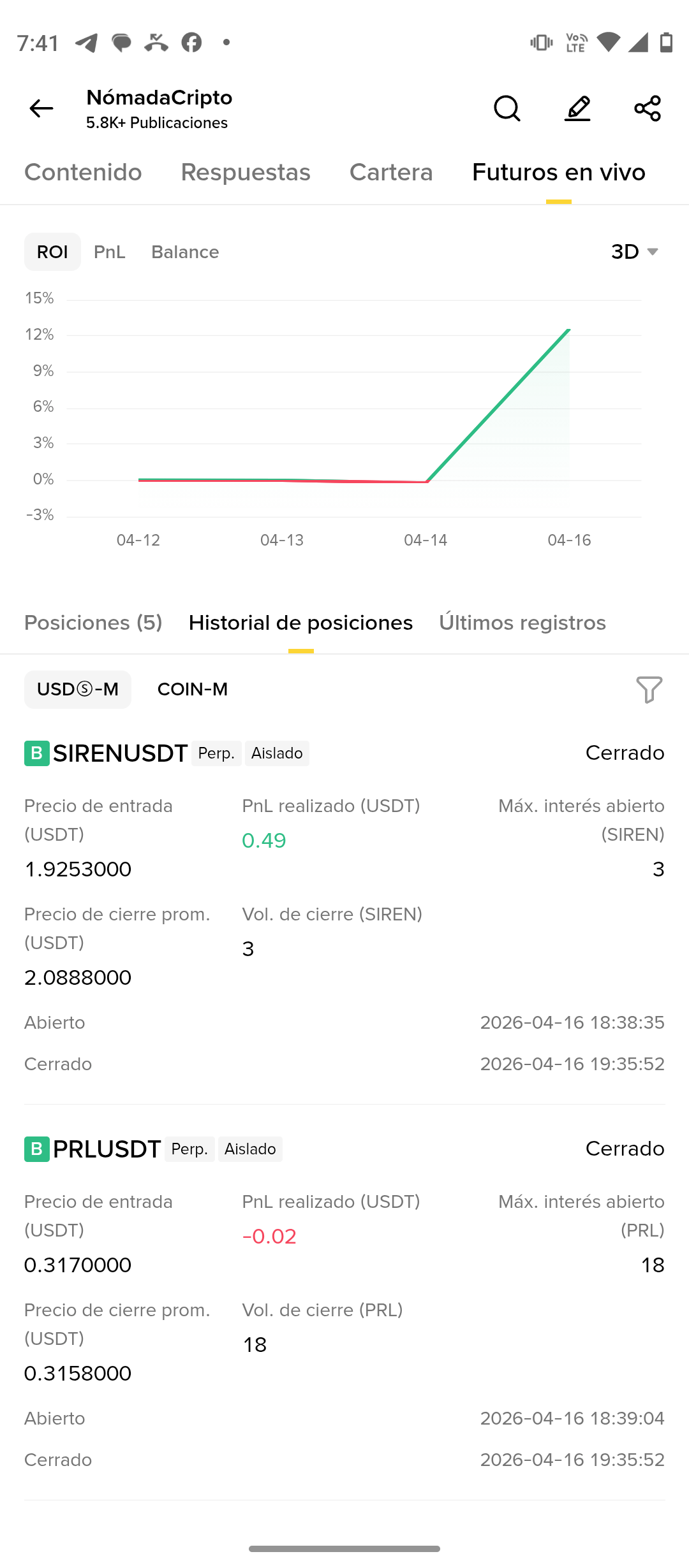 📊 operaciones cerradas con resultados mixtos (ganancia en SIRENUSDT, ajuste en PRLUSDT)