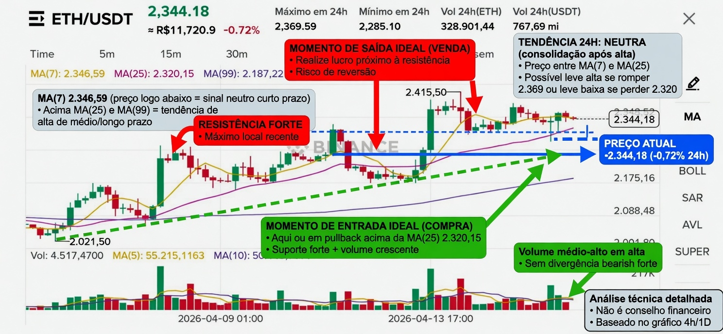 O gráfico mostra o par ETH/USDT em timeframe aproximado de 4h (visível pelos candles e intervalo de datas de 09 a 13/04/2026, com zoom que cobre cerca de 4-5 dias). Preço atual: US$ 2.344,18 (queda de -0,72% nas últimas 24h), com máximo de 24h em 2.369,59 e mínimo em 2.285,10.