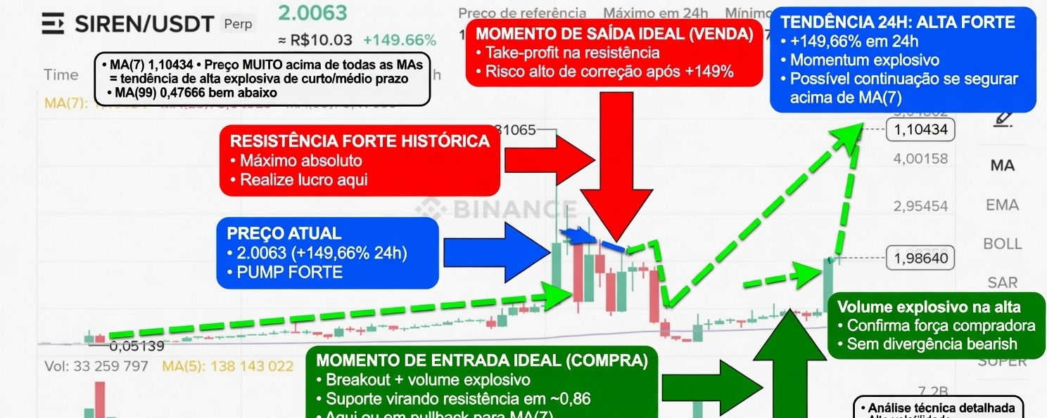 O gráfico mostra o par SIREN/USDT Perpetual em timeframe 1D (visível pelo intervalo de datas de fev/2026 a mar/2026 e candles diários). Preço atual: US$ 2.0063 (+149,66% nas últimas 24h!!), com máximo de 24h em 2.2380 e mínimo em 0.7967. Volume de 24h: 308,13 milhões de SIREN.