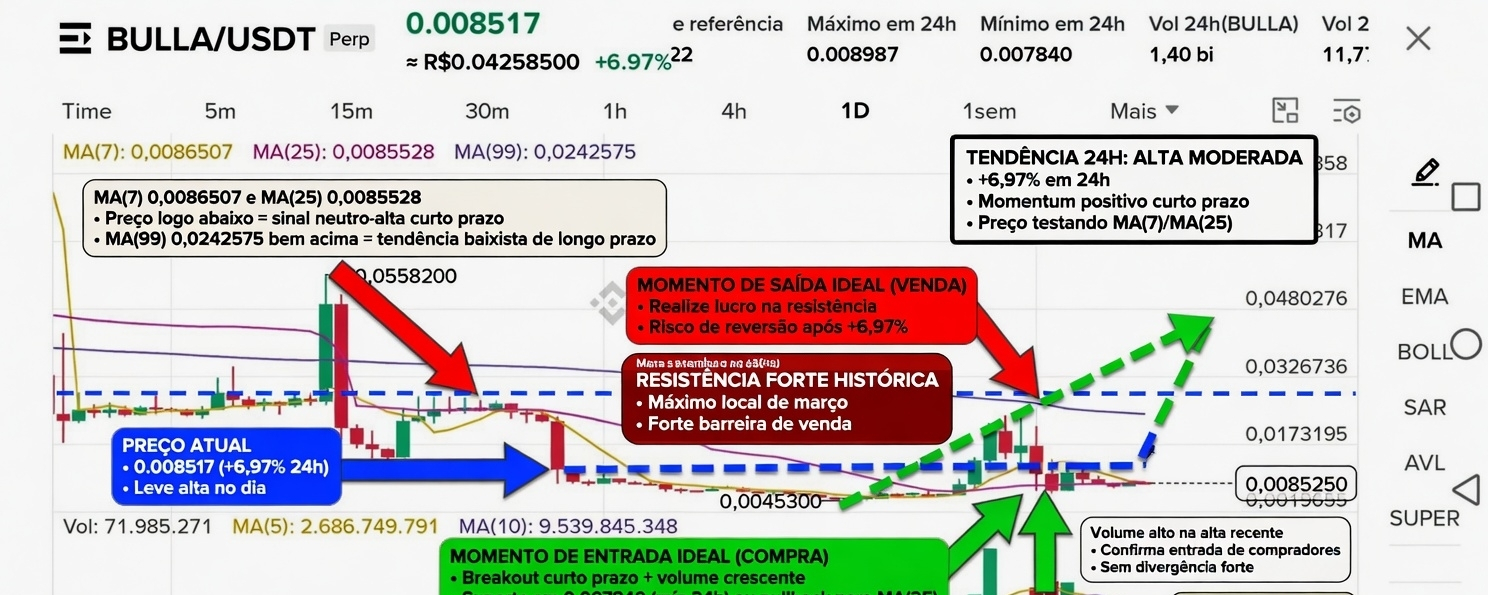 - Melhor ponto: no suporte atual 0.007840–0.00800 ou em pullback para a MA(25) 0,0085528 com candle de confirmação verde.
