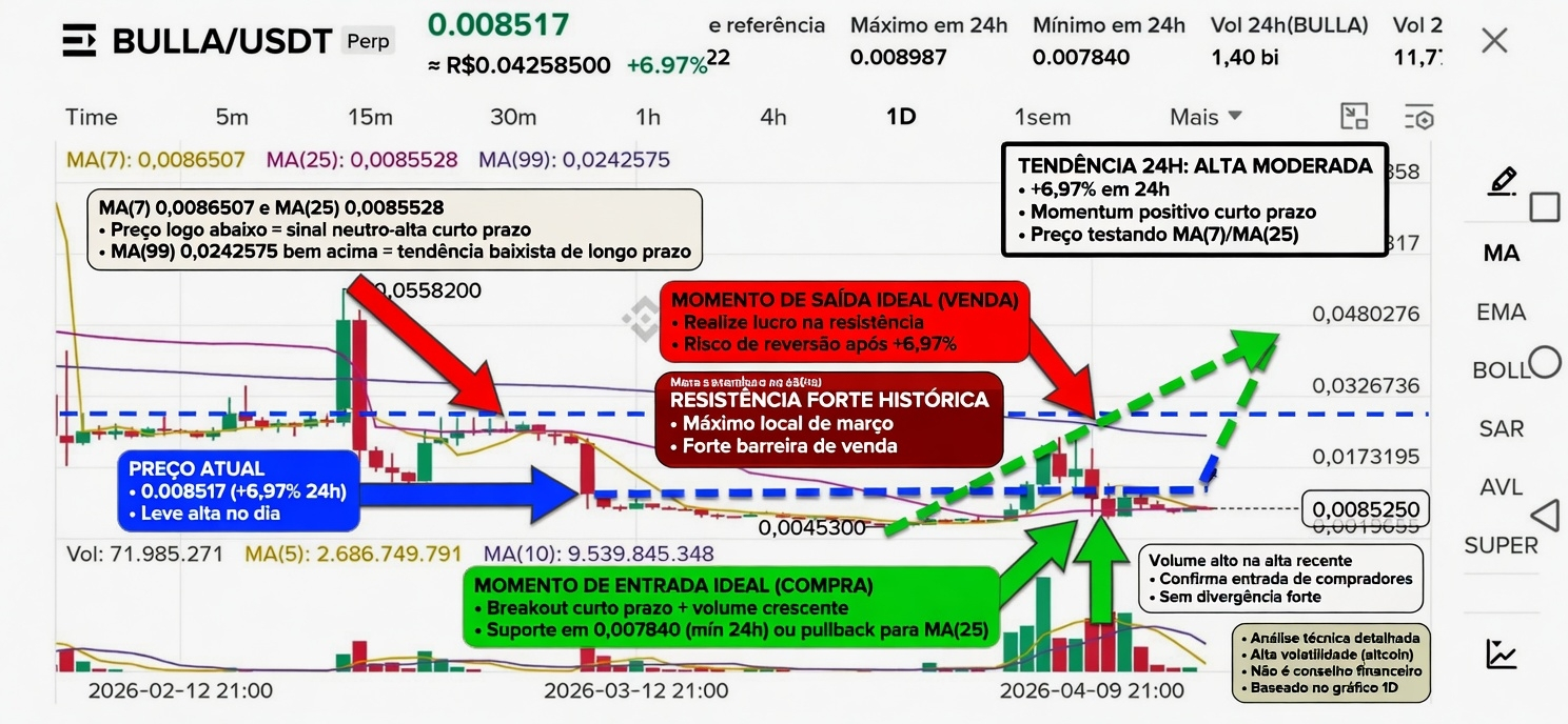 O gráfico mostra o par BULLA/USDT Perpetual em timeframe 1D (visível pelo intervalo de datas de fev/2026 a abr/2026 e candles diários). Preço atual: US$ 0.008517 (+**6,97% nas últimas 24h**), com máximo de 24h em 0.008987 e mínimo em 0.007840. Volume de 24h: 1,40 bilhão de BULLA.
