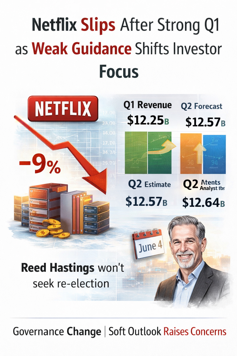 The main pressure point was Netflix’s second-quarter revenue forecast of $12.57 billion, which came in below the $12.64 billion analysts were looking for. That gap is not huge in absolute terms, but for a stock priced on growth and execution, even a modest miss can quickly affect sentiment. In other words, the market seemed to say that a beat on Q1 matters less if the next quarter looks softer than hoped.
