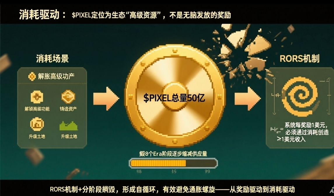 接着说说第三个,我觉得项目的代币经济模型走的是消耗驱动路线。 往上查询的消息是$PIXEL总量50亿枚,他被被定位为生态里的高级资源,用来解锁各种高级功能、铸造资产、升级土地等等,这个并不是可以无脑发放的奖励。另外我感觉配合RORS机制(比如之前写过的系统每奖励1美元$PIXEL,必须通过消耗创造至少1美元收入),完美的形成自循环,我觉得这样就有效的避免通胀螺旋。